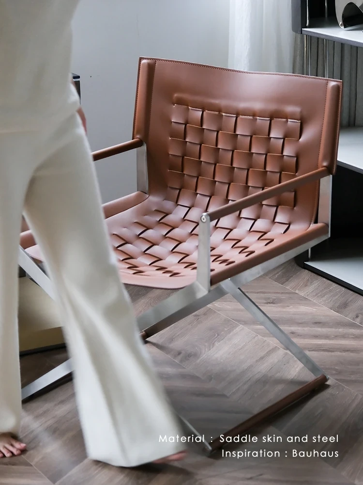 若奈 BV-Wave 1966/クラシック編み込みサドルレザーアームチェア バウハウススタイル スチール脚 アウトドアチェア 家庭用 - 快適さとスタイルを兼ね備えた一品、あなたの空間を格上げします!