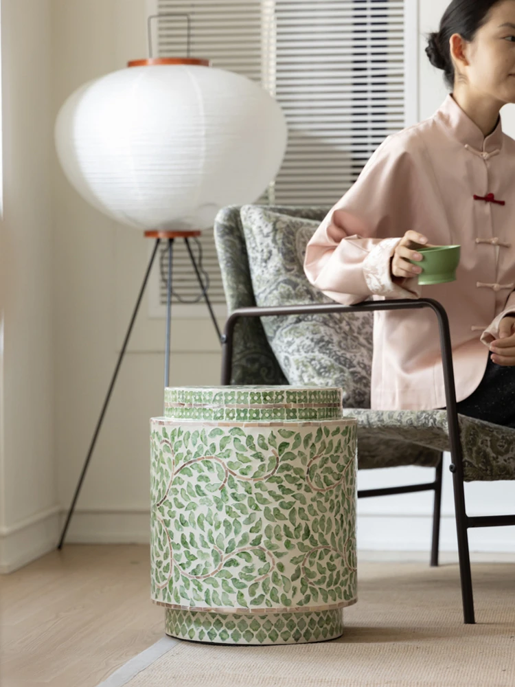 若奈家具 輸入品 貝母インレイ付きサイドテーブル スツール 南洋風 春のグリーンとインディゴブルーの青花デザイン 多機能シューズベンチ